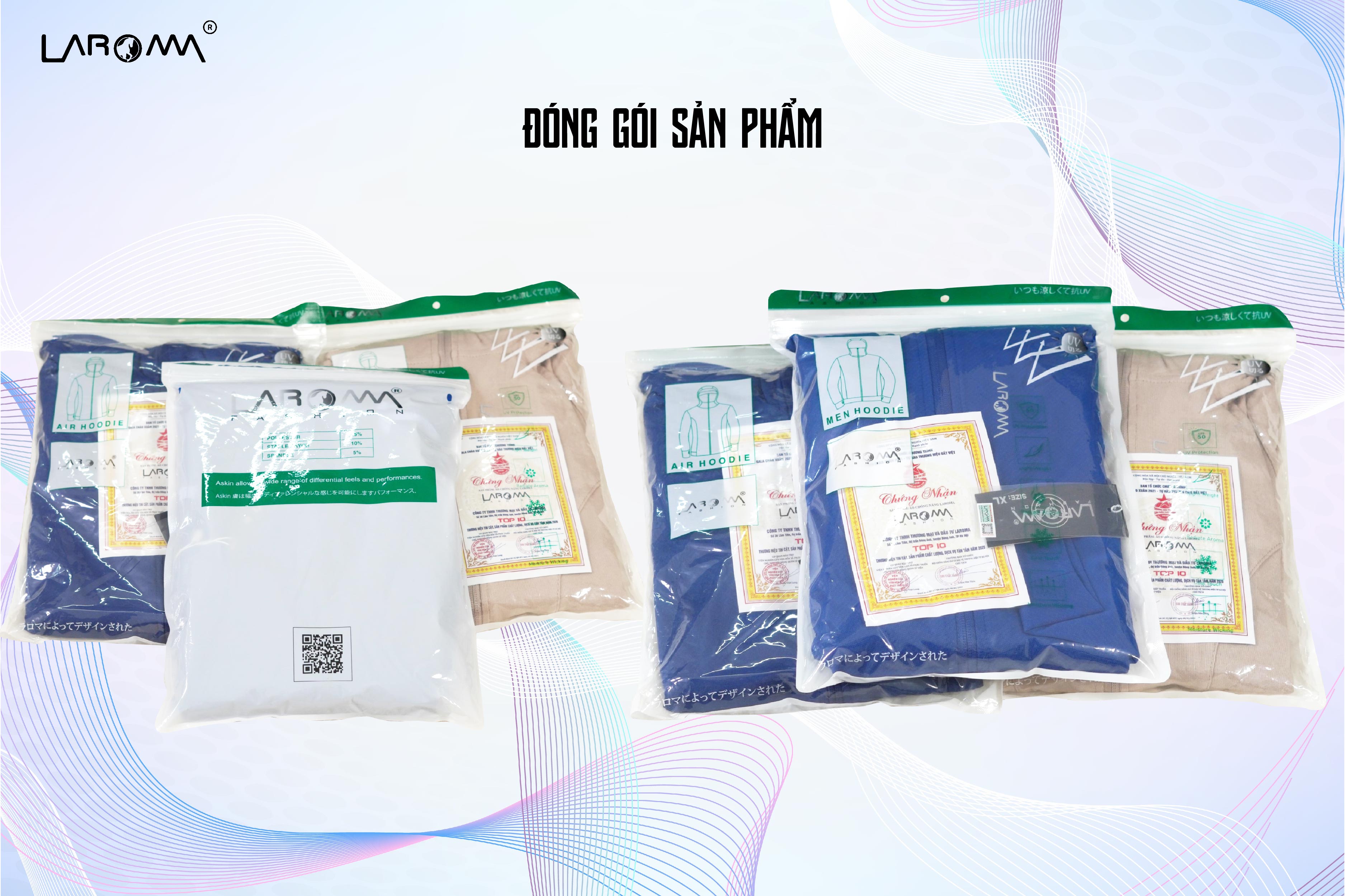 Túi Zip: Áo chống nắng Laroma chính hãng được đóng gói trong túi zip có mã QR in phía trên túi giúp khách hàng truy xuất nguồn gốc sản phẩm bằng cách quét mã QR Code.