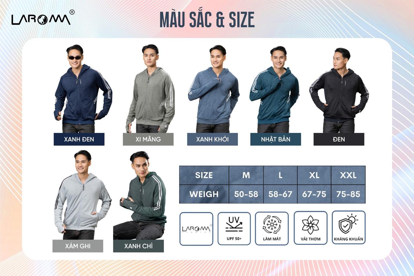 Áo chống nắng Laroma có 7 gam màu thời trang dễ phối đồ: Nhật Bản – Đen – Xi măng – Xanh chì – Xám ghi – Xanh đen – Xanh khói.