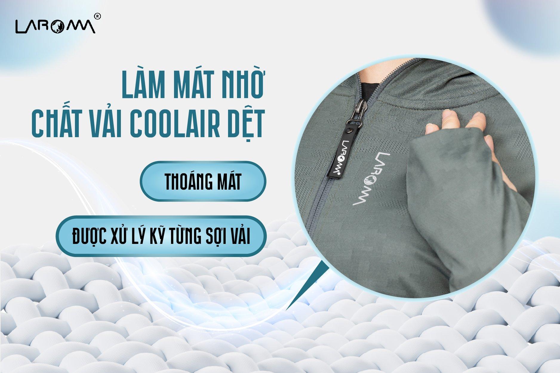 Chất liệu Cool Air được dệt từ sợi tổng hợp với cấu trúc lỗ nhỏ li ti, giúp thoát mồ hôi và khí nóng nhanh chóng, tạo cảm giác mát mẻ, dễ chịu cho người mặc, đặc biệt là trong thời tiết nóng bức. Bên cạnh đó, chất liệu này có trọng lượng siêu nhẹ, mang lại cảm giác thoải mái và linh hoạt khi vận động, không gây gò bó, khó chịu khi phải mặc nhiều áo để che nắng như các chất vải thông thường. Chất liệu Cool Air còn có độ mềm mại cao, mịn màng khi chạm vào, thân thiện với làn da. Điểm mấu chốt khiến Laroma lựa chọn chất liệu này chính là khả năng thấm hút mồ hôi tốt với tốc độ bay hơi nhanh giúp các sản phẩm áo chống nắng luôn khô ráo, hạn chế tình trạng ẩm ướt, khó chịu.
