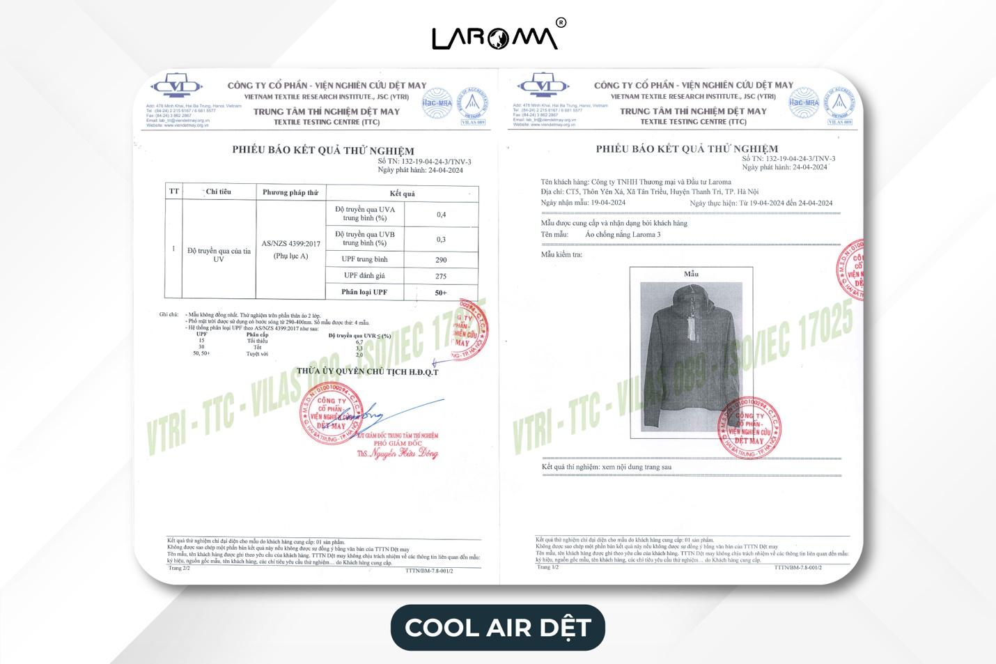 Giấy kiểm định áo chống nắng của Laroma đã được Viện Nghiên Cứu Dệt May Việt Nam đã kiểm định 2 lần và chứng nhận áo chống nắng Laroma đạt chuẩn UPF50+ theo giấy kiểm định số TN: 132-19-04-24-3/TNV-3 vào ngày 24/04/2024. Việc này khẳng định áo chống nắng Laroma là một trong những áo chống nắng tốt nhất hiện nay tại Việt Nam xét trên khía cạnh chống tia tử ngoại (UV).