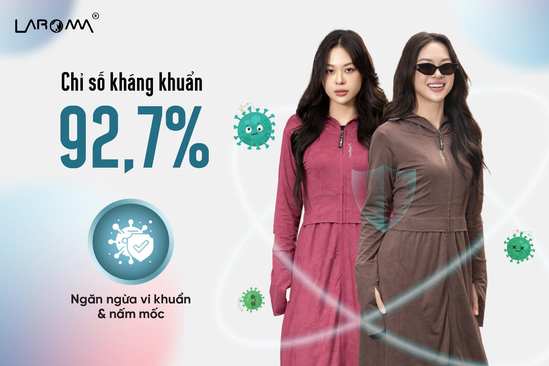 Từng sản phẩm của Laroma trước khi được đưa ra thị trường đều được nghiên cứu tỉ mỉ từ khâu lựa chọn chất vải cho tới khâu sản xuất. Chính vì vậy, sản phẩm sẽ được tích hợp tất cả công nghệ xử lý sợi vải hữu hiệu nhất, đem lại trải nghiệm sử dụng tốt nhất cho người dùng. Với chỉ số kháng khuẩn lên tới 92,7%, áo chống nắng Laroma có khả năng kháng gần như hoàn toàn vi khuẩn và nấm mốc trong điều kiện sử dụng hàng ngày, ngăn ngừa vi khuẩn tiếp xúc với làn da của người mặc.